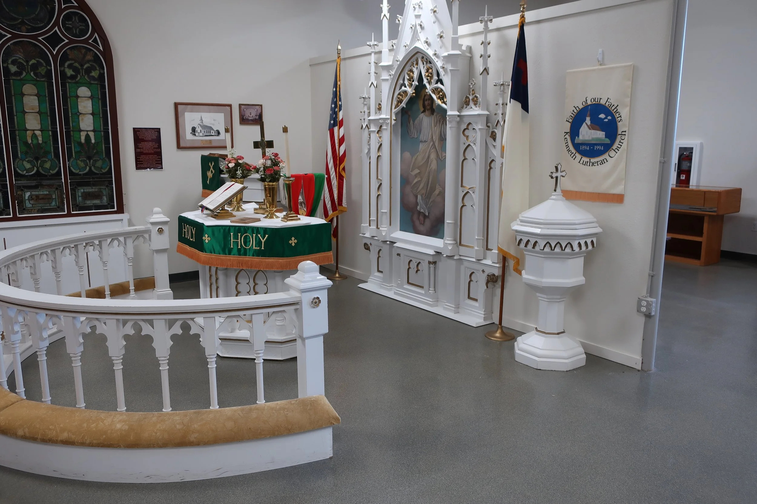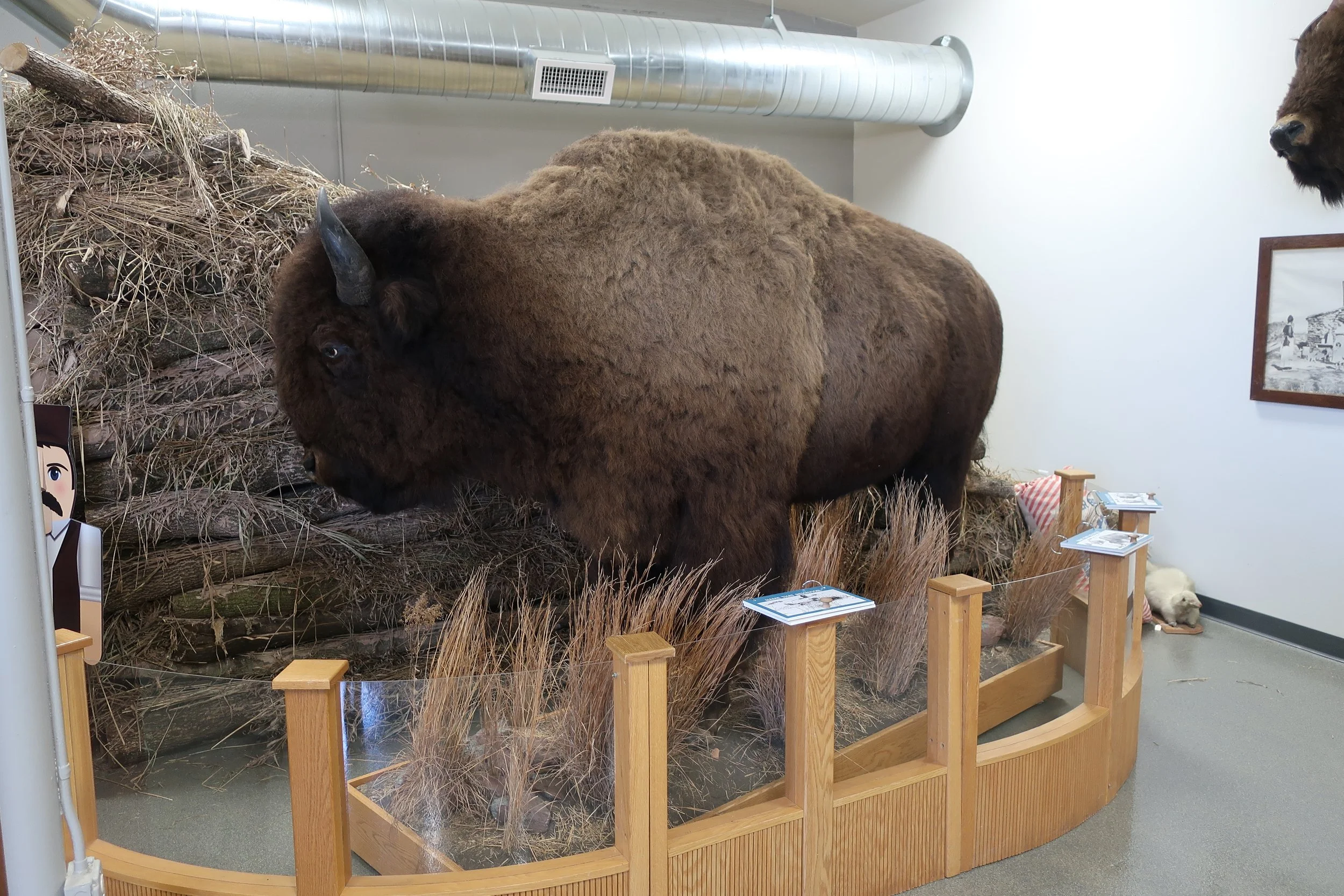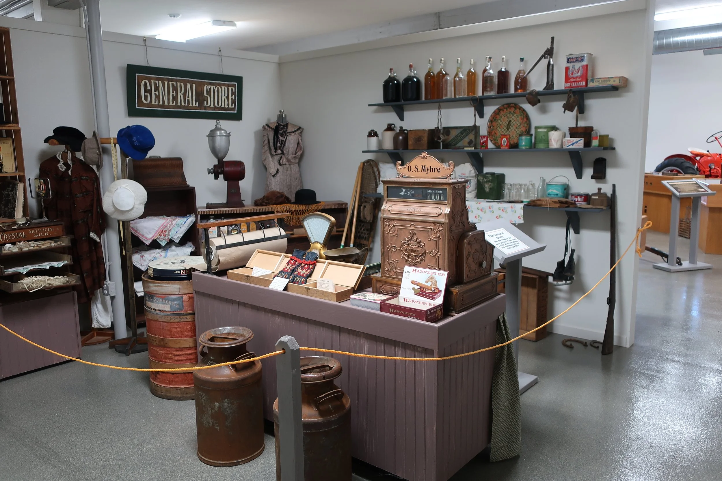 The first settlers spent their first winter in a shanty on the banks of Ash Creek. A replica to demonstrate the size and shape of this dwelling is in the room. There also is a life-size buffalo on loan from Blue Mound State Park. You can see a covered wagon and some of the original tools used by the early settlers. Other displays show an early schoolroom, a general store, a kitchen, a living room, a department store, a barber, shop, etc. Churches were important in early Rock County and the church display has authentic altars, baptismal font, and pews donated from area churches.